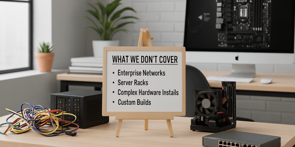 To keep pricing fair and service fast, we focus on everyday home and small-business tech. We do not take on: